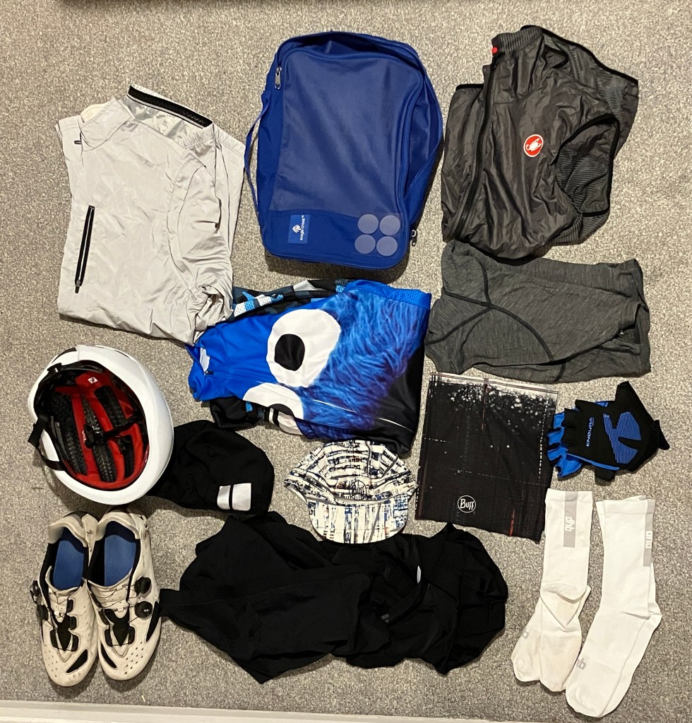 Regular clothes – for when we get off the bike. Goal is absolute minimum and a chance to let the body have a change and recover from cycling. Think loose and warm