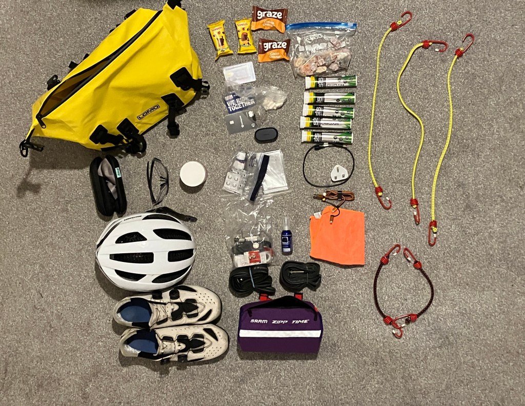 This is the charging cables, lights, repair tools, electrolytes and the snacks for start of Day 1.